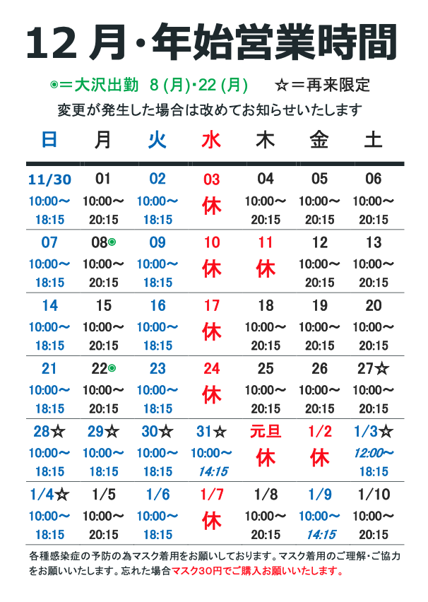 例年通り、年末年始は予約制限(再来限定、初回予約不可)期間とさせていただきます。
