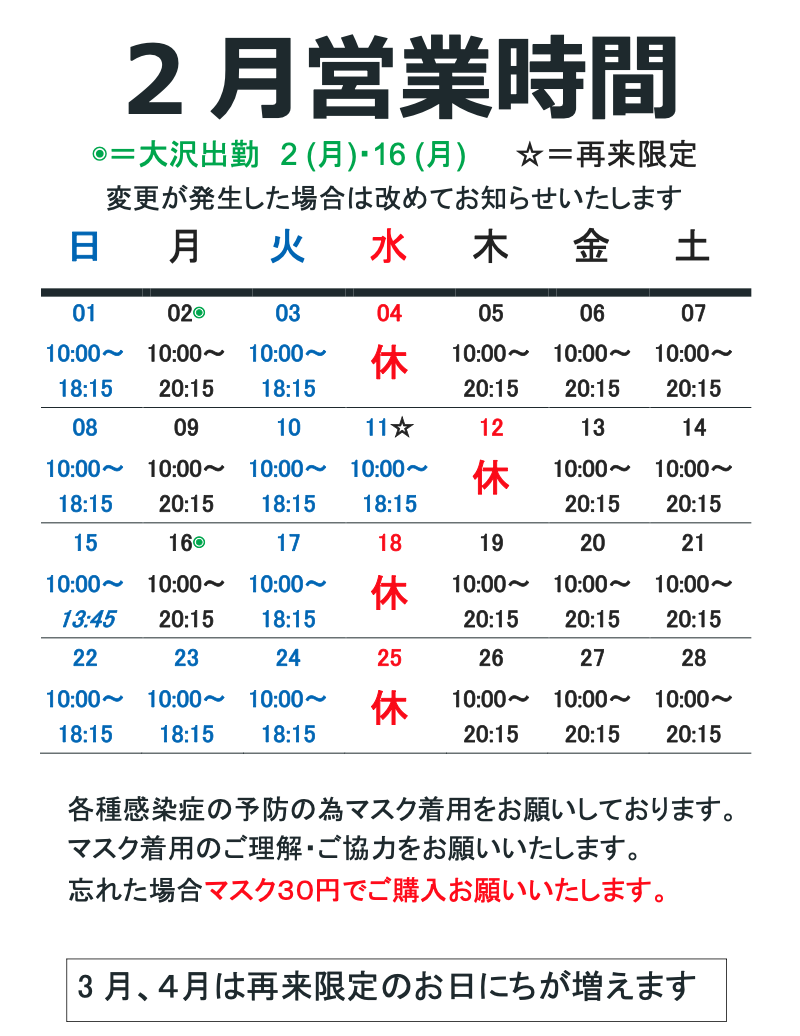 通常は毎週水曜日が休みなのですが、2月第2水曜日に祝日が珍しく当たったので11日水曜日は営業いたします。この日は再来の方限定でご予約を承ります。