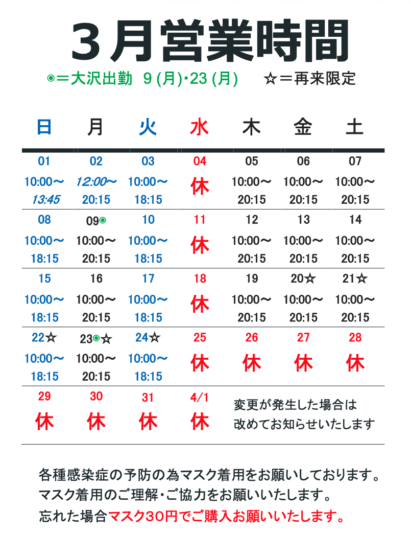 4月、5月は再来限定でのご予約受付日が増えます。初回ご予約ご希望の方は3月中のご予約がお勧めです。